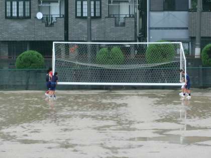 サッカーの試合中に、とても激しい雨が降り出し、選手たちもグラウンドも水浸しに・・・。