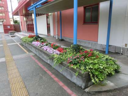 色とりどりの正門・体育館前の花たち。