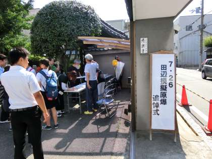 本日、東住吉区の恩楽寺において、太平洋戦争で田辺の地に投下された模擬原爆の犠牲となった方々の追悼式が行われました。
