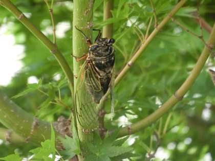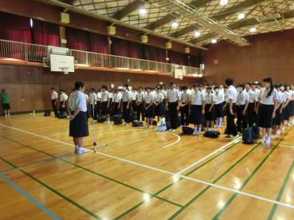 木々の蝉の声が響く中、体育館で平和登校の集会です。
