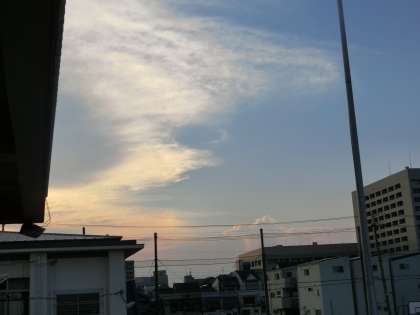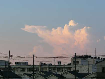 西の夕陽から日が射し、雲をほんのり赤く染めています。
