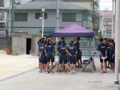 休憩はテントを活用し、帽子の着用と水分補給で熱中症対策を行っています。