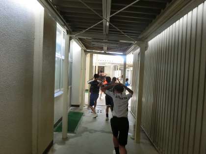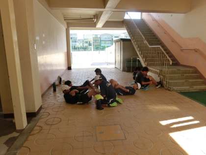 サッカー部、テニス部は、廊下やピロティーでトレーニングです。