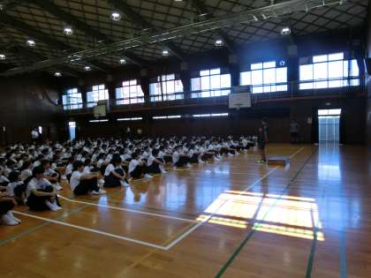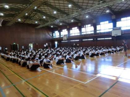 日焼けした生徒たちが集合し、体育館で始業式を行いました。