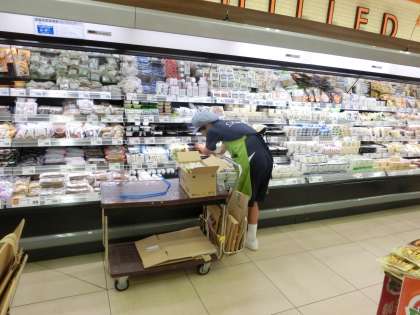 食料品売り場では、男子生徒が教えに従って、新しい商品を並べています。