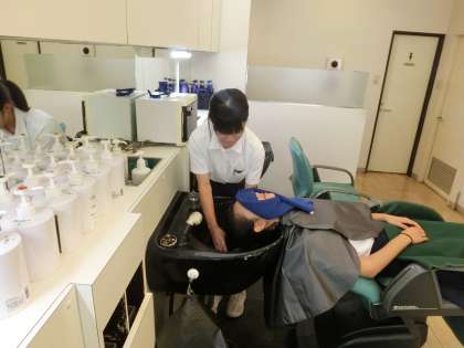 今日は、髪の洗髪から。生徒が仰向けになって、モデルに!