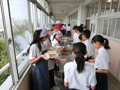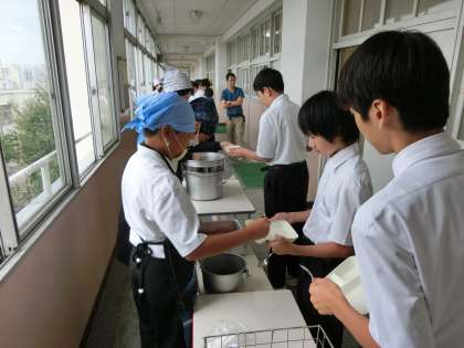 係生徒と先生が、テキパキと配膳してくれています。