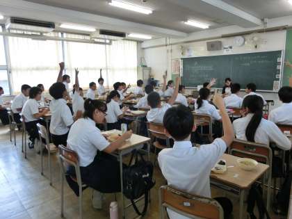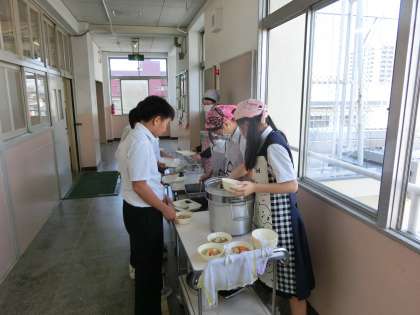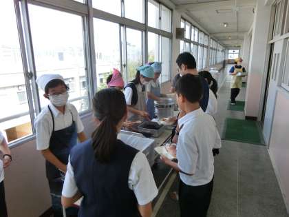 係生徒は、エプロン・三角巾・マスクもつけ、テキパキと配膳してくれています。