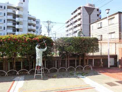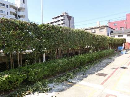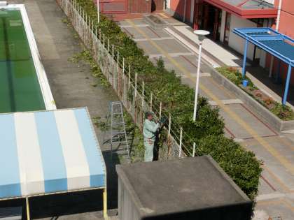 プールの授業が終了し、プールサイド横の珊瑚樹が散髪されています。