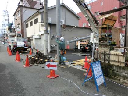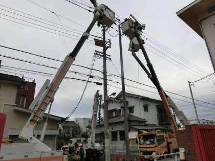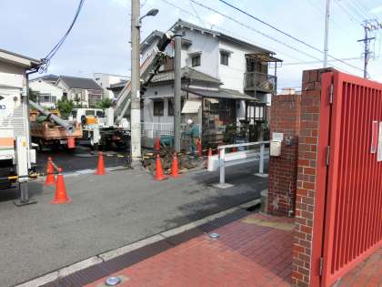 本日、学校の正門前道路で、電柱の付け替え工事が行われています。