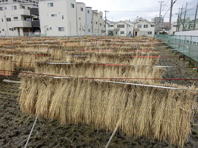 刈り取られた稲穂を見ながら、児童さん、生徒たちは登校しています。