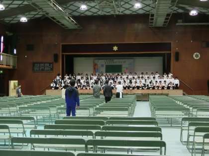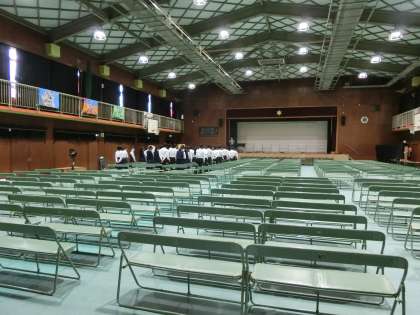 今朝は、文化祭の会場準備ができあがった体育館で行いました。