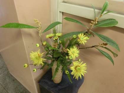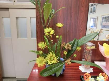 明日の文化祭を前に、地域ボランティアの皆様にお花を活けていただきました。
