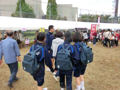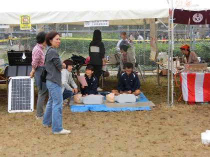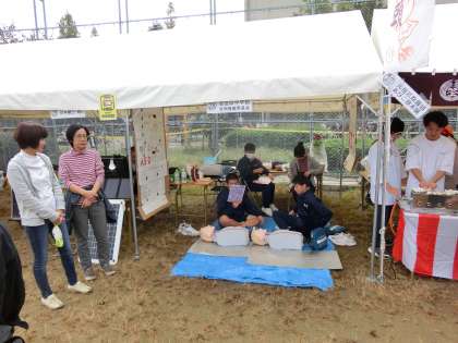 中学校の保健委員会が、応急手当とAED体験、活動展示を行っています。