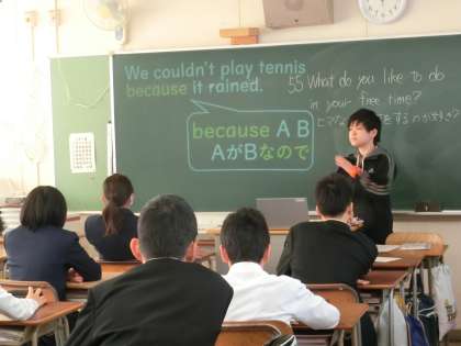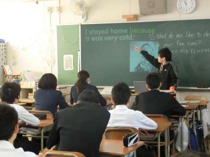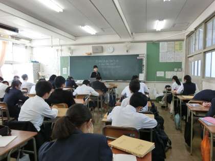 板書事項とプロジェクターで英文を写しながら、わかりやすく授業が展開されています。
