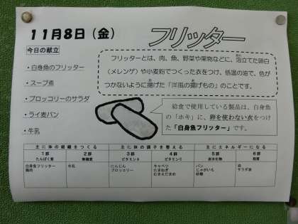 本日のメニューは、「白身魚のフリッター」「野菜たっぷりスープ煮」です。