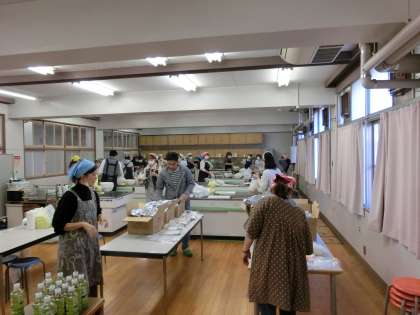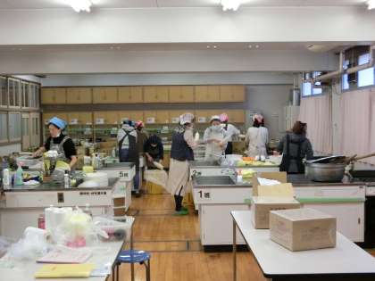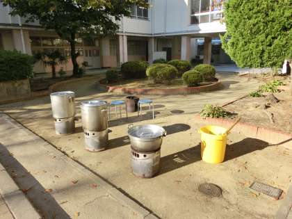 PTAの役員・実行委員の皆様は、早くも調理室で、炊き出し訓練を開始しました。