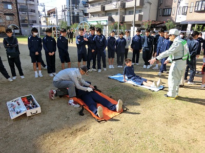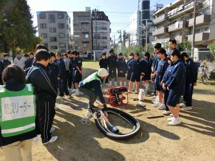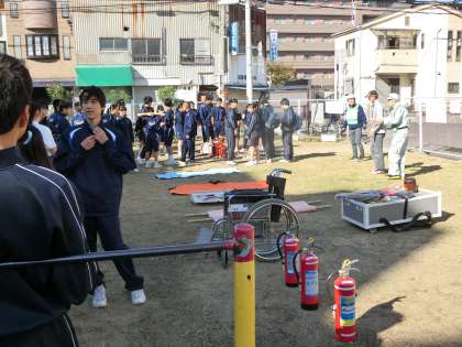消火器の訓練、車椅子、簡易トイレ、簡易担架、消化ポンプ。