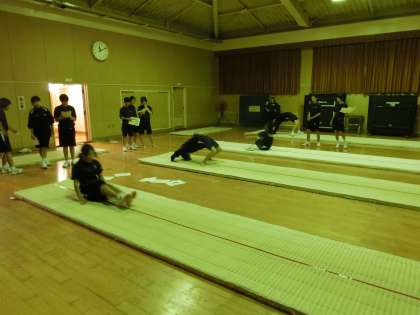 30秒間で、前転・後転、開脚前転、開脚後転、倒立前転、ブリッジなど、七つ以上の種目を連続で演技して行きます。