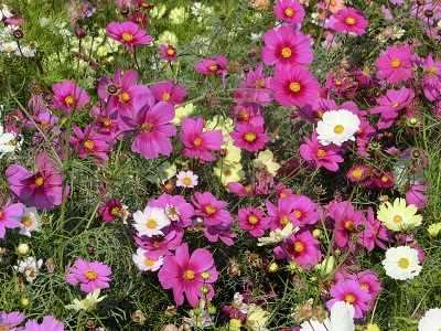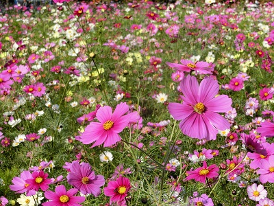 紫や白のコスモスが、いっぱい広がっています!