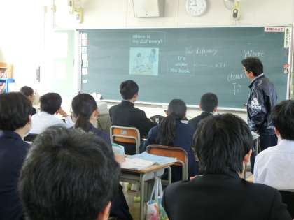 プロジェクターの活用で、黒板にさし絵と英文が映し出されています。