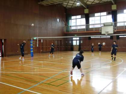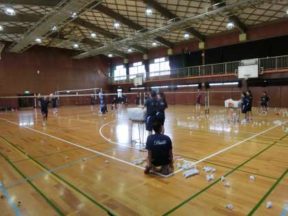 体育館では、バドミントン部とバレー同好会が練習を始めました。