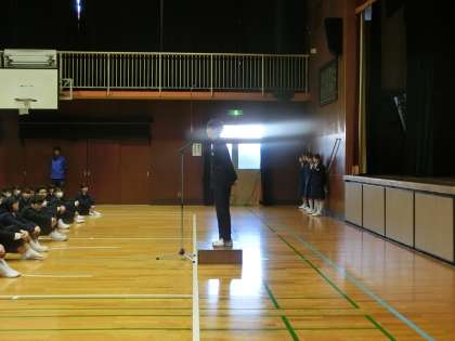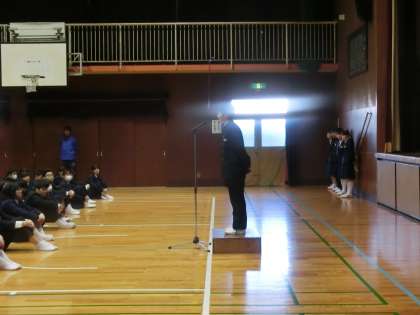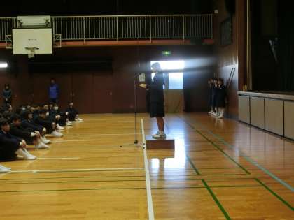 全校集会で、生活委員会、体育委員会、図書委員会の委員長から報告がありました。