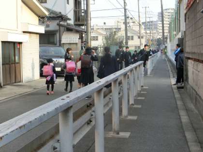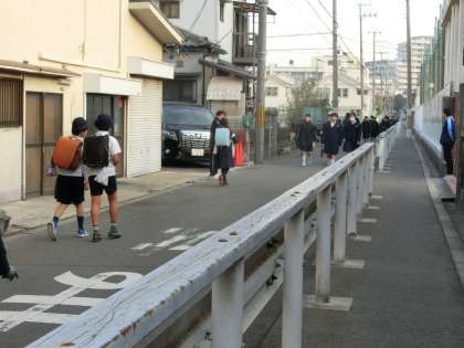 太陽の光が注ぐなか、児童さん、生徒たちが登校し始めました。