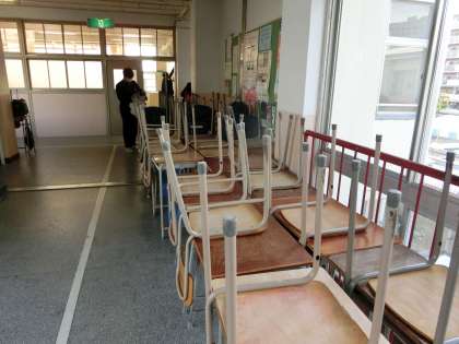 廊下に机椅子・教卓などを出して、教室内をキレイにはいて、ワックスを伸ばして行きます。