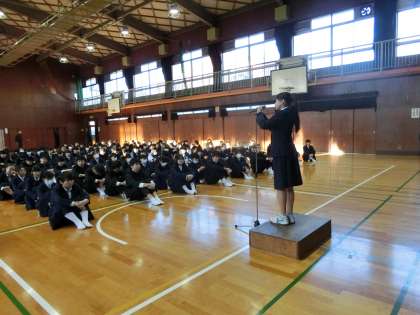 予鈴前に集合完了し、生徒会役員の号令で、集会が始まりました。