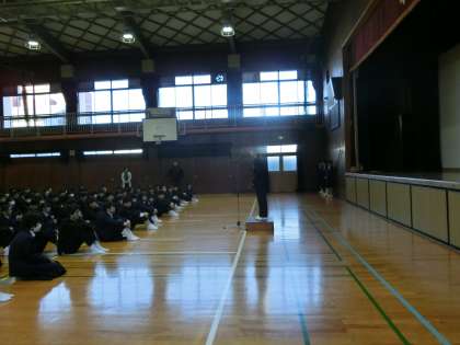 今朝も体育館で全校集会です。