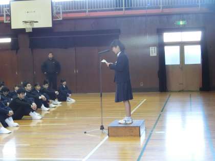 先週、生徒会役員から、中学校いじめフォーラムのスローガン「いじめ STOP 見逃し 0(ゼロ)」を発表してもらいました。さて、実行できていますか。