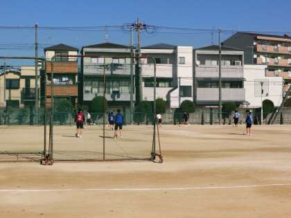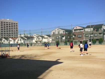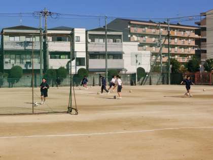 青空が広がり、グラウンドでは暖かさの中で、サッカーの授業が行われています。