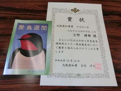 来年度の愛鳥週間ポスターの応募で、3年の宮野君が「大阪府知事賞」を獲得しました。