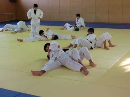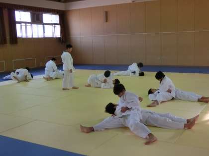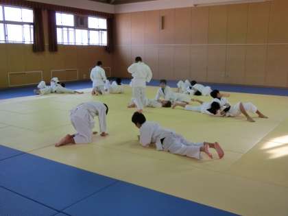 格技室での男子体育、柔道の授業です。