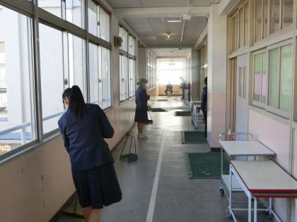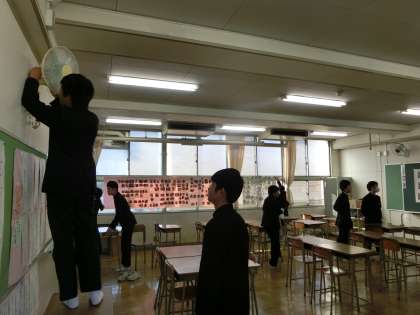 洗面所や廊下、教室のエアコンのフィルターや、暑い夏にお世話になった扇風機をキレイにします。