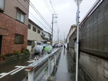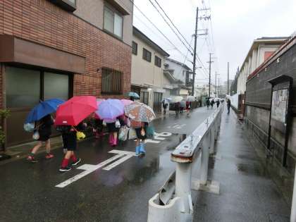 時折、激しい雨が降る中、児童さん・生徒たちが登校してきました。