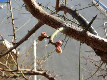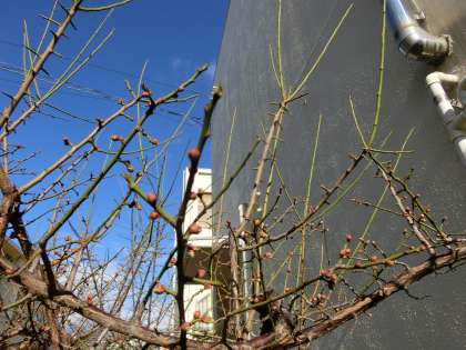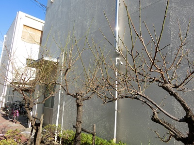 校舎横の寒梅。小さな蕾が、少し膨らんできました。