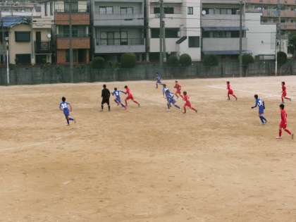 試合開始。赤のユニフォーム、大領イレブンが駆け巡ります。