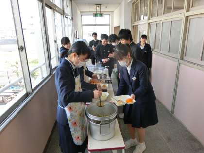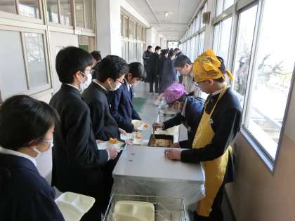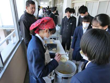 配膳係が、グラタンや野菜スープを器に入れていきます。
