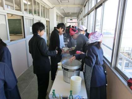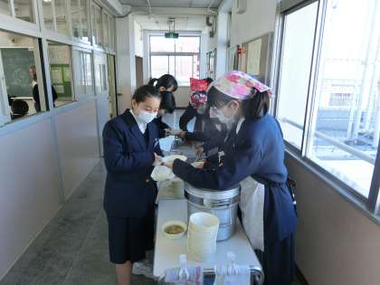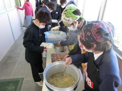 午前の授業が終了し、給食の準備に入りました。