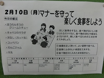 今日のメニューは、「ほうれん草のクリームシチュー」「キャベツのサラダ」「洋なし」です。