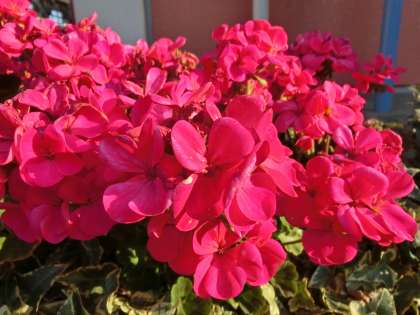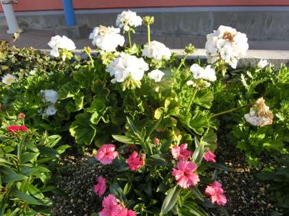 体育館前の花たちも、朝日を浴びて、リラックスしているよう。