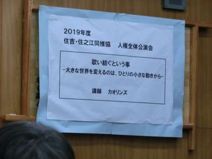 講師のカオリンズ様から、「歌い紡ぐという事 大きな世界を変えるのは、ひとりの小さな動きから」と題して、歌によるメッセージと、貴重な体験談をお聞きしました。