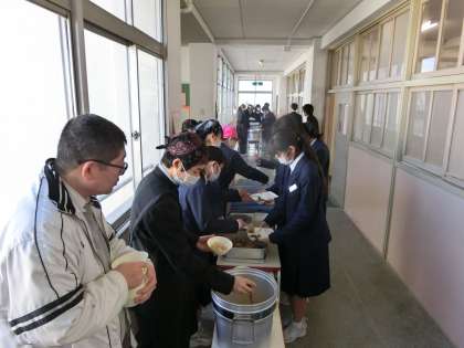 本日のメニューは、「マグロの甘辛焼き」「具だくさんの豚汁」「くきわかめの佃煮」です。