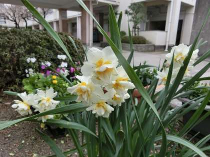 寒の戻り。 校庭の、満開の水仙も、震え上がっています。