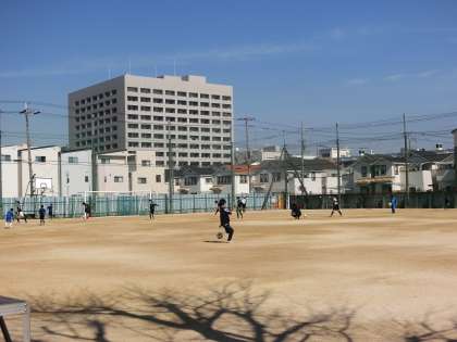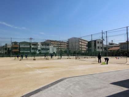 グラウンドでは、お天気の中、テニス部、サッカー部が練習しています。