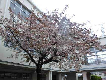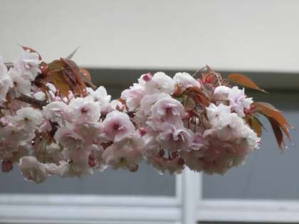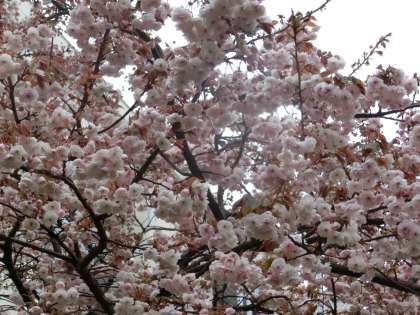昨夜の激しい雨にも耐え、八重桜が満開に近づいています。