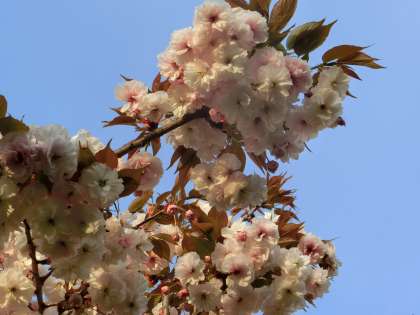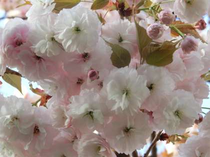 昨日の強い風で、八重桜の花びらは少し散りましたが、満開の美しさは続いています。