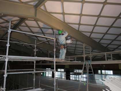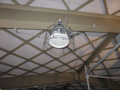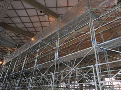 体育館の照明設備の付け替え工事は順調に進んでいます。今日は、工事現場に入らせていただき、工事の進み具合を見せていただきました。以前に設置されていた蛍光灯の照明設備は撤去されていました。ご覧のとおり新しくLEDの照明設備の設置作業の最中でした。